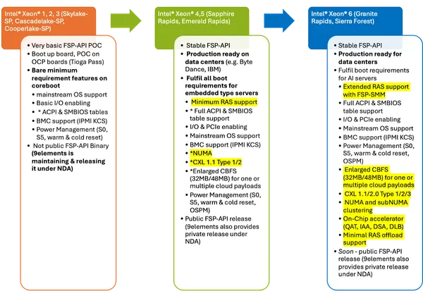 The diagram below demonstrates coreboot continuous improvement for Xeon® Gen 1 to Gen 6 platforms: